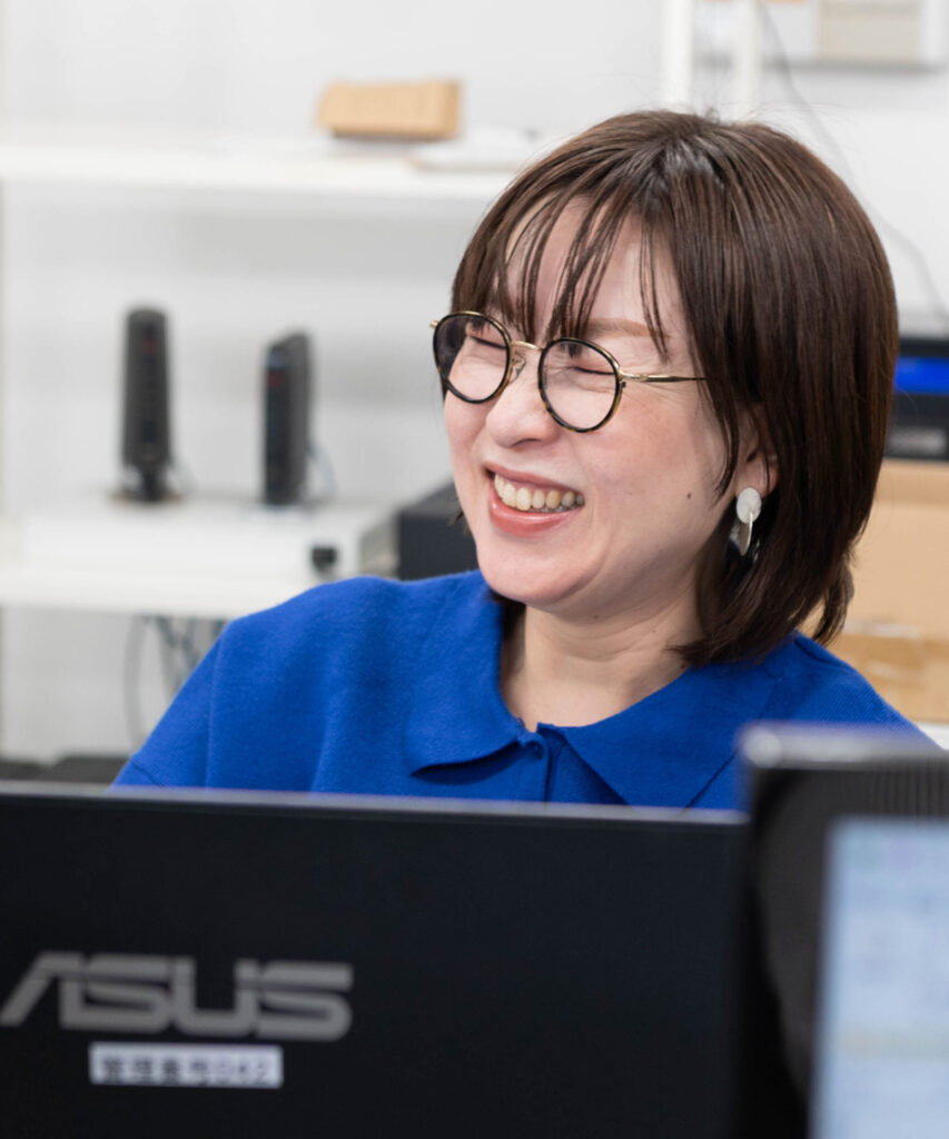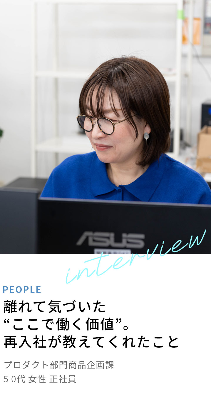 入社当時、私はパートとして企画部門に入りました。立場に関係なく責任ある仕事を任せていただき、企画部から品質管理部へ異動してからは、品質向上に注力し、さまざまな商品の成長に携わりました。改良した商品がお客様のもとに届き、良いレビューをいただけたときには、大きな喜びとやりがいを感じたことを今でもよく覚えています。