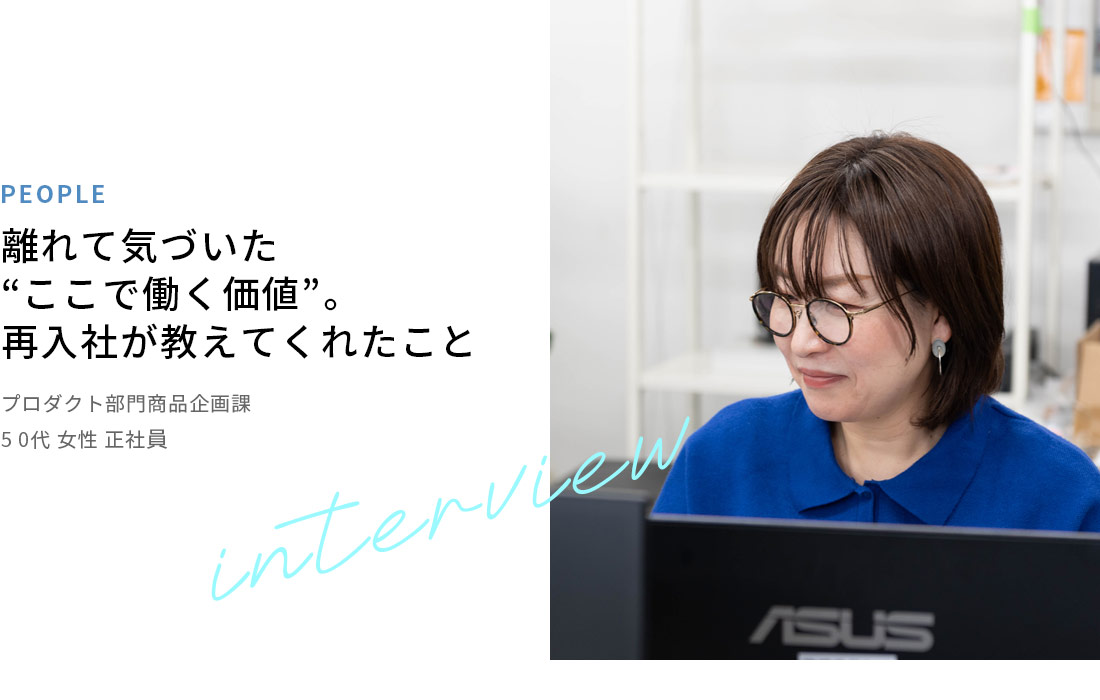 再入社後は「仕事を楽しもう!」という前向きな姿勢が、以前よりもさらに強くなったと感じています。復帰後は再び企画部に配属され、サプライヤーと協力しながらより良い商品づくりに取り組んでいます。商品がお客様に評価されたときには、やはり大きな喜びとやりがいを感じます。